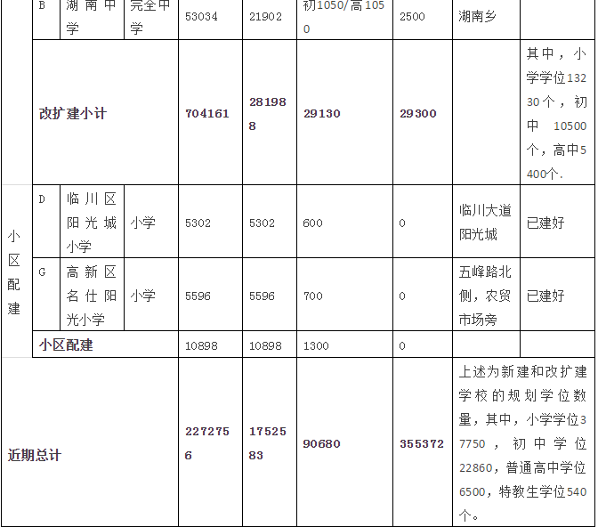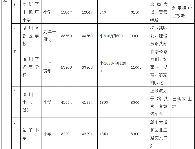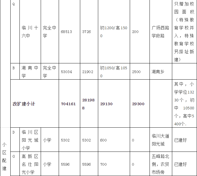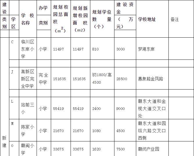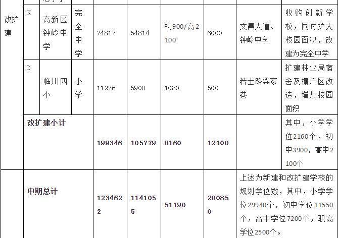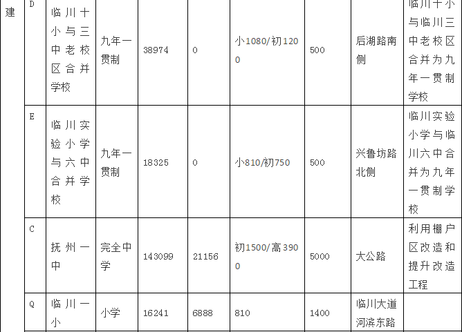 中期擴建2所小學(xué),為臨川四小和撫北中心小學(xué);擴建1所初中,為臨川四中;改擴建鐘嶺中學(xué)(收購創(chuàng)新學(xué)校,同時擴大校園面積)為完全中學(xué)。