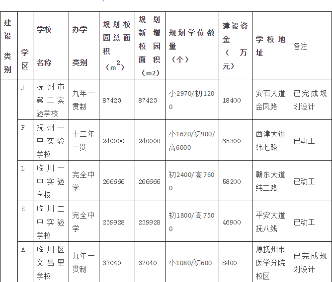 近期臨川城區(qū)新建5所小學(xué),為電機廠小學(xué)、臨川十五小、金安小學(xué)、站前小學(xué)、臨川二小二部;新建9所九年一貫制學(xué)校,為文昌里學(xué)校、名仕學(xué)校、汝水學(xué)校、曾鞏學(xué)校、竹山學(xué)校、撫州市第二實驗學(xué)校、城北學(xué)校、新區(qū)學(xué)校、河西學(xué)校;新建3所民辦性質(zhì)的實驗學(xué)校,為撫州一中實驗學(xué)校、臨川一中實驗學(xué)校、臨川二中實驗學(xué)校;新建2所特殊教育學(xué)校,為撫州市特教學(xué)校和臨川區(qū)特殊學(xué)校(異地新建)。